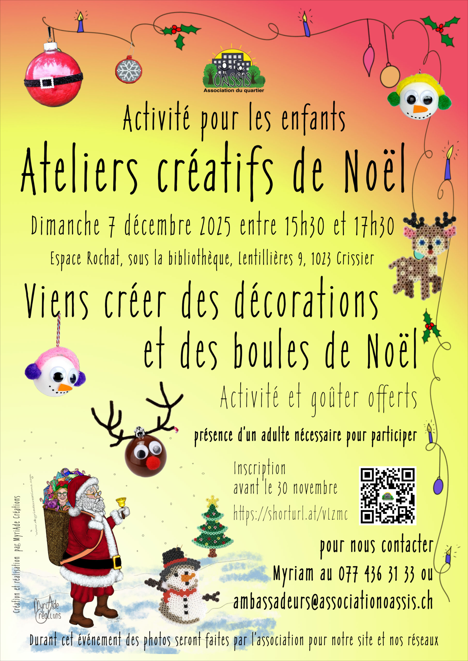 🌟 L’association de quartier d’OASSIS invite les enfants à venir créer des décorations et des boules de fêtes lors d’ateliers créatifs à l’Espace Rochat, le dimanche 7 décembre 2025 de 15h30 à 17h30. 🎈