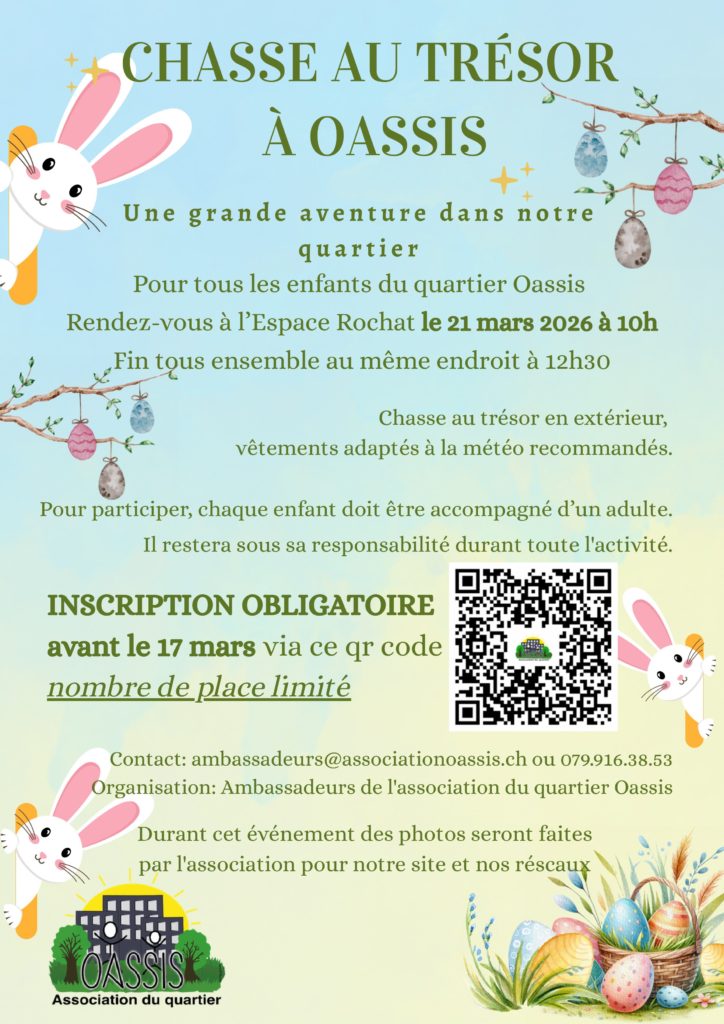 L’association du quartier OASSIS vous attend le samedi 21 mars à 10h à l’Espace Rochat (fin au même endroit à 12h30) pour la grande chasse au trésor de Pâques.